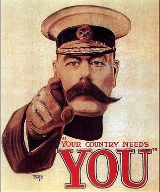 Kitchener's first recruiting poster appeared on 11 August. We've all seen it, Lord Kitchener, his finger pointing straight out fixing the reader with his gaze and the famous words "Your country needs you" printed underneath. It is widely believed to be the most successful, influential and imitated recruiting poster of all time. It was certainly the most imitated but as for the rest, it's just not true, whilst the image and the words did exist the poster as such did not.